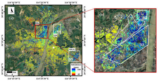 (a) Persistent Scatterer Interferometric Synthetic Aperture Radar (PSInSAR) cumulative deformation map in Wuhan from June 2012 to December 2019, with (b) detail over the Hankou area. The white star represents the location of the reference point. The white rectangles and irregular polygons are the five detected settlement areas (S1–S5). HK, QS, and SIGG are the abbreviations of Hankou, Qingshan, and the southern industrial park of Guanggu, respectively. The result is superimposed onto Google Earth imagery.