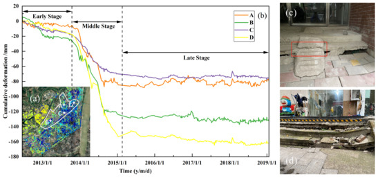 (a) Cumulative deformation map of Houhu—with the study area outlined by the white polygon and the selected points, A, B, C, and D, in red—superimposed onto Google Earth imagery. (b) The deformation curves of A, B, C, and D are compared and distinguished into the early, middle, and late stages of consolidation and compression. (c,d) Photographs obtained from field investigations to prove the damage caused to residential areas by soft soil consolidation (photographs taken by Haonan Jiang; September 2020).