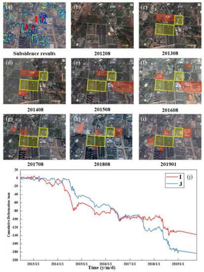 (a) Cumulative deformation map of the southern industrial park of Guanggu, with an indication of the locations of the two selected typical PS points, I and J. (b–i) Google Earth time lapse of the study area from 2012 to 2019, in which the yellow rectangles are the settlement areas centered on points I and J, and the red rectangles are the new urban construction areas that appeared from one year to another as the large-scale urban construction projects progressed. (j) Deformation curve corresponding to points I and J marked in picture (a).