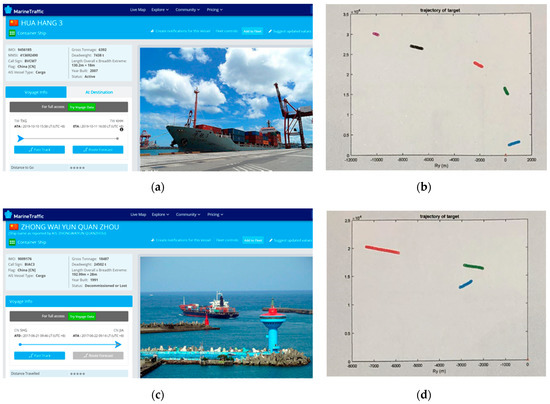 Examples of automatic identification system (AIS) information and trajectories of the collected ships. (a,c) display the pictures of two ships. (b,d) display the trajectories of the two ships displayed in (a,c), respectively.