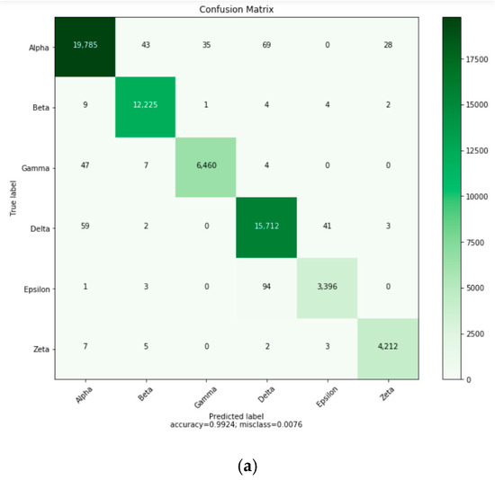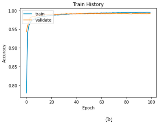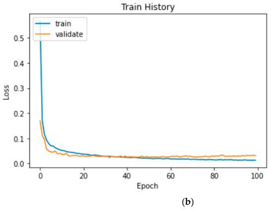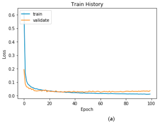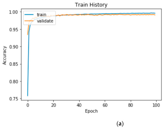 Figure 11 illustrates the recognition accuracy curves of the proposed two-channel CNN–BiLSTM model. Figure 11a presents the results for the model running on the CPU, and Figure 10b displays the confusion matrix for the model running on the GPU. Figure 12 illustrates the loss curve of the proposed two-channel CNN–BiLSTM model. Figure 11a displays the recognition accuracy curve of the model running on the CPU, and Figure 11b displays the recognition accuracy of the model running on the GPU. Figure 11 and Figure 12 indicate that the accuracy of the validation set did not increase considerably after approximately 60 epochs, and the loss of the validation set did not decrease considerably after approximately 60 epochs. According to our experimental records, when running on the CPU, the highest accuracy of 99.27% was obtained in 63 epochs in the validation set, and the loss in the validation set was 2.44%. When running on the GPU, the accuracy of the validation set reached the highest accuracy of 99.29% in 73 epochs, and the loss of the validation set was 2.47%.