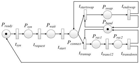 We use SPN to study the process by which messages are generated from users on the ground, then transmitted through the satellite network and finally returned to the ground. According to the above communication process and referring to the model in [38], we construct an SPN model of the traditional satellite network communication process, as shown in Figure 5.