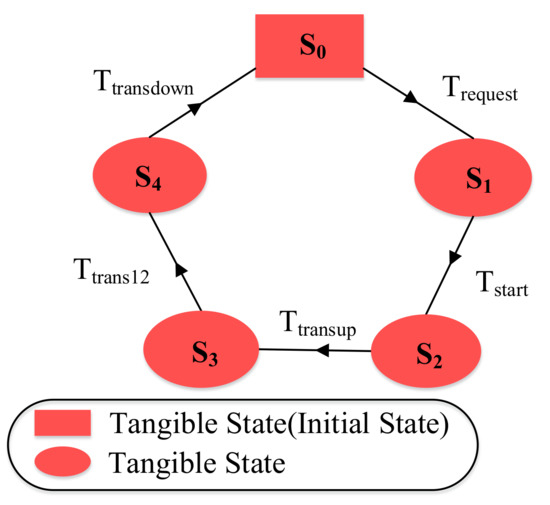 P represents the finite set of places, which means the possible local state of the system; T represents the finite set of transitions, which describes the event that can trigger a change in the state of the system; F represents the finite set of directed arcs, which denotes the connection between the state of the system and the event, with the direction either pointing from place to transition or from transition to place. If there exists an arc that goes from a place P to a transition t, then P is termed as an input place of t. Conversely, if there exists an arc that goes from t to P, then P is termed as an output place of t. A transition may have one or more input and output places; W is called weight, which is the weight (positive integer) carried on the arc, and is 1 by default; represents the initial marking, understood as the initial state of the whole system, is an m-dimensional vector, m denotes the total number of place P, and the p th content of M, denoted , represents the number of tokens in the p th place; Tokens are usually contained in places, and can be transferred over different places as the transition occurs. In order to simulate the dynamic behavior of the system, the state or tokens in the Petri Net change according to the following transition (trigger) rules: