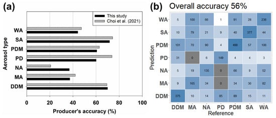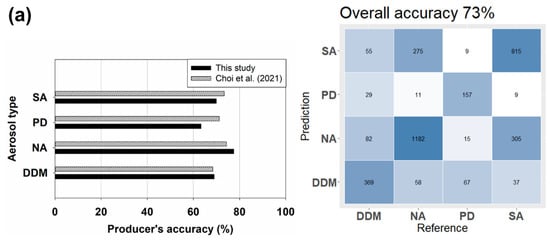 (a) producer’s accuracy (PA) and (b) confusion matrix for each aerosol with the classification of seven aerosol types (PD, DDM, PDM, SA, MA, WA, and NA).