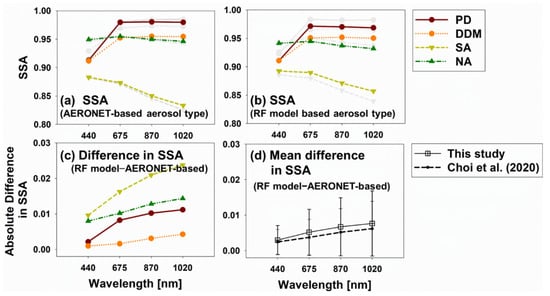 Wavelength dependence of single-scattering albedo (SSA) at 440, 675, 870, and 1020 nm for (a) AERONET aerosol types and (b) RF aerosol types (this study); (c) the absolute difference in SSA for each aerosol type; (d) average differences in SSA. Error bars represent the standard deviation of the SSA difference. The gray-colored graphs indicate the values suggested by Choi et al. [25].