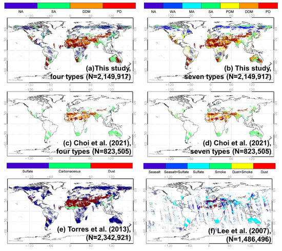 Comparisons of spatial distributions of aerosol types classified from (a) RF-based algorithm with a reduced number of input variables in this study (four type classification), (b) RF-based algorithm with a reduced number of input variables in this study (seven type classification), (c) RF-based algorithm in Choi et al. [25] (four type classification), (d) RF-based algorithm in Choi et al. [25] (seven type classification), (e) Torres et al. [9], and (f) Lee et al. [12] on 26 March 2018.