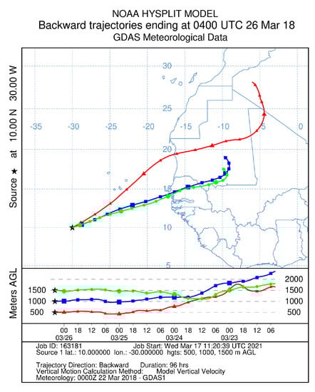 - Stein, A.F.; Draxler, R.R.; Rolph, G.D.; Stunder, B.J.B.; Cohen, M.D.; Ngan, F. NOAA’s HYSPLIT atmospheric transport and dispersion modeling system. Bull. Amer. Meteor. Soc. 2015, 96, 2059–2077. [Google Scholar] [CrossRef]