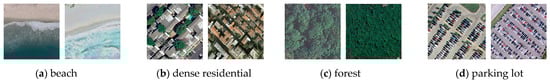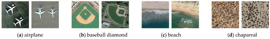 Because there is no specialized dataset for transfer learning research in remote-sensing scene classification, we combine the four different public datasets of scene classification and build some new sub-datasets with the common classes to test knowledge transfer. Specifically, we randomly select two datasets as the source domain and target domain, respectively, and the corresponding common categories of the two datasets are used for training and test data. Due to containing far fewer samples, WHU is only used as a target domain. As a result, the detailed common classes are listed in Table 2, and we form nine pairs of source and target domain, and they are shown in Table 3. For convenience, we abbreviate the four datasets to U (UCM), N (NWPU), R (RSI), and W (WHU). The detailed samples of common categories for the two datasets are listed in Figure 8, Figure 9, Figure 10, Figure 11, Figure 12 and Figure 13. Furthermore, the dataset as the target domain is divided into a training set and a test set at the ratio of 80% and 20%. The results are the average for five times. We used Adam [56] to optimize our model and the learning rate is set to 0.001 with 0.5 decay per 10 epochs. We set the batchsize to 128. ResNet-50 [8] is used as the backbone CNN for the generator. We conduct the experiment in Pytorch and on GPU NVIDIA Tesla T4.