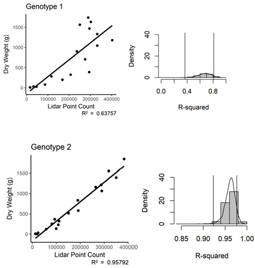 Our group also tested the relationship between the LiDAR data and the leaf-only dry weight. This was conducted for the registered and subsampled and the single-scan subset LiDAR datasets. For each of these analyses, the point count of each plant’s entire point cloud was regressed against the plant’s leaf dry weight. A bootstrap analysis was conducted for each. A by-genotype analysis using the leaf dry weight was conducted for both the registered and subsampled and the single-scan subsampled datasets. This was conducted by subsetting the dataset by genotype and then running the same analysis as mentioned above.