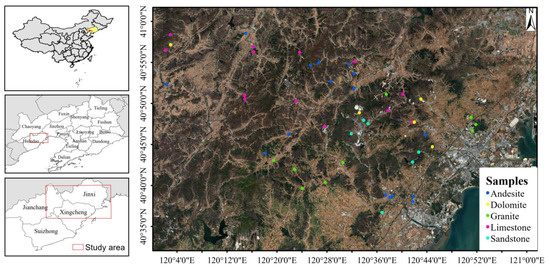 The study area is located in Huludao, a southwest coastal city with many hills in Liaoning Province, China. This region is on the West Block of North China Craton, which is one of the oldest Archean cratons in the world, and experienced widespread tectono-thermal activity since the late Mesozoic [38,39]. The various lithological rock outcrops with different characteristics can be found in this area.