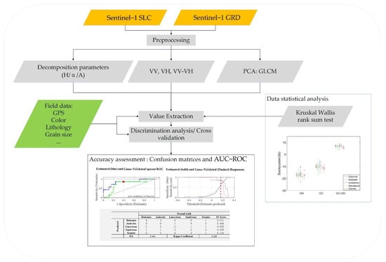 More efforts are needed to put into improving the discrimination accuracy in the future. The balance between spatial resolution and outcrop area needs to be considered carefully. Though we already chose the samples with an outcrop area as big as possible, the backscatter signals can still be affected by the border effects from the surrounding environments. Further studies can be conducted in arid or semi-arid places with plenty of outcrops to exclude the surrounding influence. Also, more samples with various properties should be included to ensure adequate variation and explore the SAR scattering mechanism. The multi-sensor approach can also improve the model accuracy. Thurmond et al. [68] mentioned that merging optical and radar data is an effective way of identifying different lithologies on the basis of their spectral features and surface roughness.