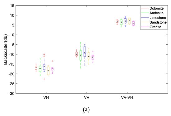 After the extraction of corresponding features, the statistical boxplots were demonstrated in Figure 3, which presents the variation in backscatter coefficients (VV, VH, VV-VH) and decomposition parameters (H/α/A) derived from different rock types. In general, the mean value of backscatter coefficient VH for dolomite, andesite, and granite varies around −17 db. Sandstone has a relatively lower mean VH value (−18.3 db) and limestone has a slightly higher mean VH around −16 db. The mean VV of limestone (−9.2 db) shows an obviously higher value than that of andesite (−10.7 db), sandstone (−11.1 db), and granite (−11.2 db), whilst the mean VV of dolomite locates around −10 db. From Figure 3a, we can also notice that granite has a lower mean (VV-VH) value at around 5.6db than that of the other 4 lithological classes. The differences of the mean VV-VH among dolomite, andesite, limestone, and sandstone are unobvious. Whereas for the decomposition parameters, the variations of mean H and A for dolomite, andesite, limestone, granite, and sandstone are small, and H and A values are around 0.65 and 0.6, respectively. As for the Alpha, limestone has a substantial-high mean value at around 21 degrees compared to that of andesite and sandstone (around 19 degrees). Dolomite and granite almost have a same mean Alpha (around 20 degrees). According to Figure 3b and [43], the majority of the rock samples have a medium entropy surface scattering with the mean alpha values clustered around 20 degrees and entropy values clustered around 0.7.