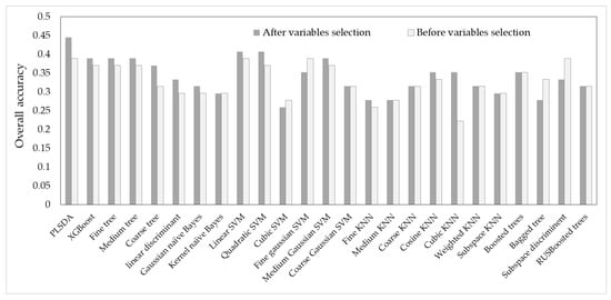 Variable selection was carried out to reduce the data redundancy in this study. The comparison between the overall accuracies of models using all variables and selected variables (Figure 5) indicates that the variable selection does not work for all classifiers. One reason is that the methods used for selection are embedded-type selection and may only work well with a particular learning process. Another reason is the difference among the mechanisms of different classifiers. However, variable selection is still recommended to serve as a baseline for choosing the final input variables when the sample size is limited.