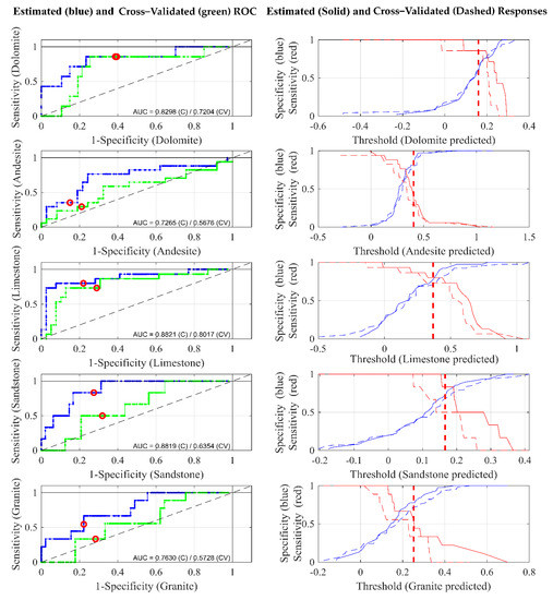 Both estimated and cross-validated ROC curves used for assessing the specificity and sensitivity for different rock classes using PLSDA are illustrated in Figure 6. Plots on the left and right describe the same thing in different ways. Each plot on the right shows the 1-specificity versus the sensitivity as a function of the selected threshold, while the plot on the left demonstrates the change of specificity and sensitivity with various thresholds. The corresponding AUC values for each rock class are listed in the ROC graphs. According to [53], AUC with a value of 0.7 to 0.8 indicates the predictive ability of the models is acceptable, AUC with a value of 0.8 to 0.9 indicates the predictive ability is excellent and AUC bigger than 0.9 means the predictive ability is outstanding. As can be seen from Figure 6, the predictive ability of the model for limestone is excellent, with an AUC larger than 0.8. The predictive capability for dolomite is acceptable, with an AUC larger than 0.7. As for the andesite, sandstone, and granite, models are a little overfitting and models are with poor predictive capability (AUC ranges from 0.5 to 0.7).