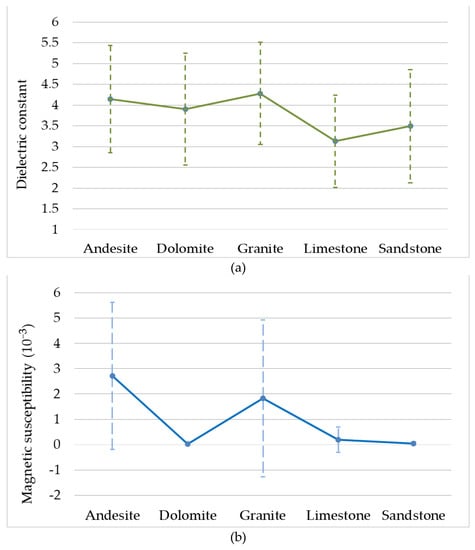 Apart from the grain size, other physical properties (Figure 7) like dielectric constant and magnetic susceptibility were also measured in the lab to help interpret the results. In general, the dielectric constant deviations of all rock classes are at a similar level (Figure 7a), while the deviation of magnetic susceptibility among different rock classes varies a lot. As can be seen from Figure 7b, compared to dolomite, limestone, and sandstone, the magnetic susceptibility of andesite and granite have bigger standard deviations, which may be caused by the various concentration of ferro-oxides. This might be another reason for the low discrimination accuracy for andesite and granite. According to [61], radar signal is strongly dependent on the dielectric constant and magnetic susceptibility, and significant scattering attenuation can be caused by higher dielectric constant and magnetic susceptibility. Our results show that the granite and andesite samples with slightly higher dielectric constant and magnetic susceptibility have smaller backscatter values compared to limestone with lower dielectric constant and magnetic susceptibility (Figure 3a).