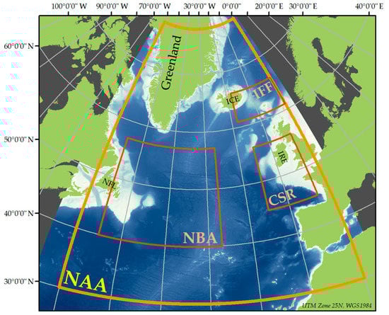 Map showing the study area, highlighting the four case study areas. These are the primary study region—the North Atlantic (NAA), and three smaller sub-regions—the Newfoundland Basin Area (NBA), the Iceland-Faroes Front region (IFF), and the Celtic Seas region (CSR). The bathymetry shown was obtained freely from GEBCO (www.gebco.net, accessed on 25 March 2021), with land and ocean area data distributed by Natural Earth (www.naturalearthdata.com, accessed on 25 March 2021).