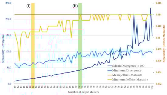 A graphical illustration of the separability analysis which determined the optimal number of data clusters. The estimates of all four separability measures between clusters are plotted against the number of clusters produced by the ISODATA clustering. Note that (mean divergence)/100 is shown for visualisation purposes. Highlight (i) in orange shows the 22 clusters which would have been selected using de Bie et al.’s LaHMa approach [], solely looking for coincident peaks in divergence measures, without consideration of the Jeffries-Matusita separability measure. Highlight (ii) in green shows the location of a peak which satisfies both the divergence peak criteria, and the Jeffries-Matusita criteria needed for the more objective OHMA approach.