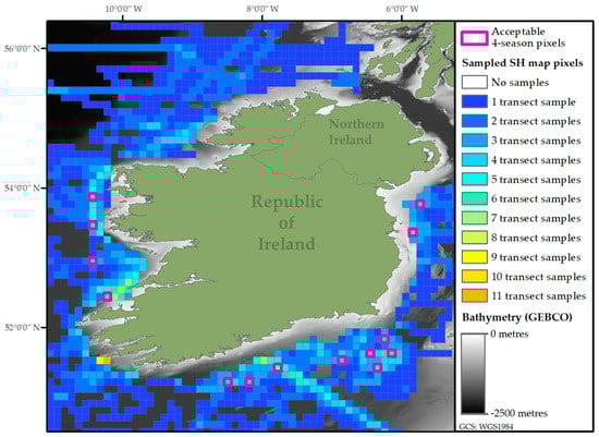 Map of in-situ Underway sampling intensity per-pixel in Irish waters, situated in the CSR case study area of this paper. The acceptable pixels to compare the STH and in-situ-derived heterogeneity values are denoted by open pink squares. These contained transit data from all 4 quarters of 2011, were nonadjacent, and were free of coastal effects.