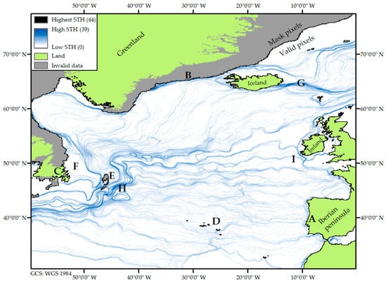The STH map produced from 2011 data for the region of interest (North Atlantic), with highlighted features. The figure shows the artifacts to expect from the OHMA process, namely the highest STH value (44) for A—coastlines, B—ice/land-linked poor data pixels, C—mixed coastal data and poor data areas, D—islands, and E—isolated poor data areas. It also shows a sample of STH features which are valid pixel estimates, including F—the Northeast Newfoundland Shelf area exhibiting no detectable cluster boundaries (i.e., a spatio-temporally homogeneous region), G—the Iceland and Faroe shelf front region, H—highly heterogeneous waters in and around the Newfoundland Basin, and I—more muted and subtle heterogeneity features in Irish territorial waters.