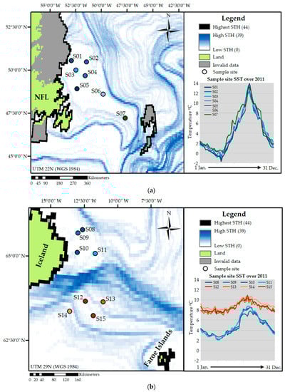 Examples of how high STH areas bound spatio-temporally homogeneous regions, and also separate regions with different temporal signals. (a) A sample of temporal signals taken from within a homogeneous region in terms of STH, located off the eastern coast of Canada; (b) A sample of temporal signals taken from a region bisected by a locally strong STH feature located off the East coast of Iceland. Both panels show how the underlying raster STH dataset captures the delineations between clusters, and not the clusters themselves.