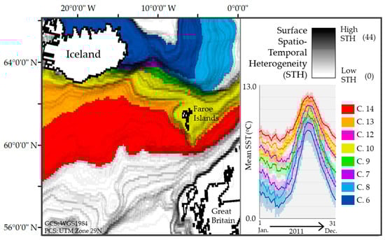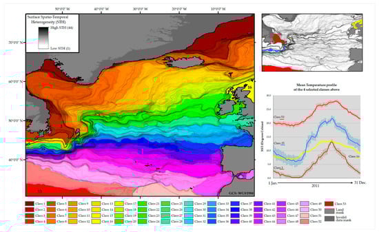 Two well-known features in the Atlantic Ocean include the North Atlantic’s (i) Subpolar Gyre, and (ii) Subtropical Gyre []. In the North Atlantic, the Subpolar Gyre is associated with a number of important overturning circulation currents, driven by changes in atmospheric forcing (winds and air–sea heat exchange). It is cyclonic in nature, and its associated boundary currents move around the North Atlantic in an anticlockwise direction. The spatio-temporal heterogeneity map (Figure 6 and Figure 8) shows higher STH values where some of the boundary currents are located (e.g., the North Atlantic Current, East Greenland and Labrador Currents shown in Figure 10). The lower part of the STH map (Figure 6 and Figure 8) shows the northern boundary of the Subtropical Gyre to the south. This demonstrates the potential in using heterogeneity features such as Earth Observation-derived fronts to reveal details of surface currents, which are not resolved by in-situ or altimetry measurements []. The STH dataset also shows a similar pattern to cold surface waters moving southwards in the Labrador Current. Boundaries depicted around the homogenous area F of Figure 6, and Class 3 in Figure 8, resemble the extent of the continental shelf ice-influenced pelagic habitat, identified in other ocean surface partitioning studies [,]