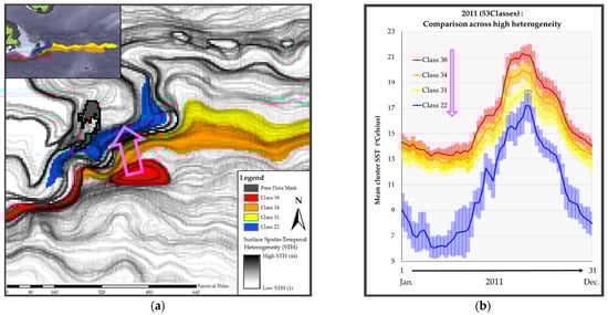 Heterogeneous areas separating water masses with different temporal characteristics in waters surrounding the Flemish Cap. (a) An example of how areas displaying high STH values separate areas of the ocean surface that display different temporal signals, across the high STH value area (pink arrow). The top left hand side insert shows the extent of these four classes across the North Atlantic. (b) The matching temporal profiles of the four clusters, depicted here using mean temperature, and standard deviation as a measure of variability across cluster pixels (error bars). Note that cluster colour is not an indication of temperature, with a pink arrow indicating the sequence of classes in both panels.