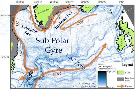 2011 surface spatio-temporal heterogeneity (STH) in relation to a selection of simplified regional features of the North Atlantic. The STH dataset produced by the OHMA process is shown, overlaid by the approximate locations of the Subpolar Gyre and main bounding near-surface currents, including the North Atlantic current (NAC), East Reykjanes Ridge current (ERRC), Irminger Current (IC), East Greenland Current (EGC), West Greenland Current (WGC), and the Labrador Current (LC). Feature locations were derived using information from [,,,].