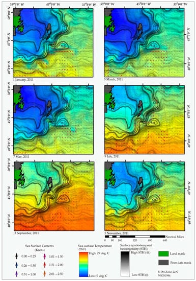 Mapping of terrestrial landscape spatio-temporal heterogeneity has been used to identify highly variable regions, highlighting the effects of stronger and dominant environmental gradients []. For clarity, in this study Surface spatio-Temporal Heterogeneity (STH) refers to the variability in an ocean-surface property across space and time. Mapping it can aid the understanding of interactions between ocean-surface systems. For example, Gratwicke gives a good summary of efforts to quantify the effects of hard, sub-surface complexity on marine life at local scales, and notes a need for habitat complexity to be considered when investigating fish biodiversity []. However, in the open ocean, the structural nature of the surface is largely determined by mobile boundaries between water masses of differing salinity, temperature, and nutrient content. Margalef noted that fronts in the ocean can be considered both as boundaries and as habitats in themselves, having the attributes of ecotones [] or transition zones between ecological communities which are linear, and less extensive than the communities they separate []. There have been numerous studies which have identified areas of front persistence, or high front frequency (for example see [,]), as regions of enhanced regional biodiversity, and species abundance. Their surface expressions, which are the only features detectable using satellite sensors, represent far more extensive structures beneath the surface, shaping the distribution of life beneath the surface [,,], and driving the region’s ecosystem functioning []. STH features vary regionally. Where the transition is not sharp enough to be delineated as a front, a gradual transition zone still separates different water masses. These soft and hard boundaries also move over space, and time, particularly in the ocean. Indeed, some regions could be characterised by their inconsistency, in terms of the presence and absence of frontal systems and water masses. It is important to recognise this, especially when examining how a region’s characteristic instability may drive the distribution of life. For example, the presence of strong upwellings can fuel enhanced productivity in some regions (e.g., the Canaries Upwelling Ecosystem []). Elsewhere it can be the effect of strong Western boundary currents and their associated structures (e.g., [] and []) which drive regional heterogeneity, and fuel productivity.