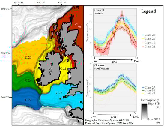 The OHMA process also produces (i) an image dataset of the optimal number of clusters that represent the variability in the hypertemporal datacube, and (ii) a signature file with the temporal statistical summaries of each cluster. Figure 8 highlights how cluster extent and temporal signature can be combined to produce map classes (e.g., Class 3), which can then be displayed with the STH information in a map format. As pixels are grouped by their temporal similarity, pixels in a cluster which are bounded by high STH values highlight regionally homogeneous areas, such as Class 3 in Figure 8. Figure 9 demonstrates how adjacent classes, separated by high STH values, exhibit a markedly different temporal signature from each other. High STH values separate the most temporally different regions, where more locally extreme values are encountered. This highlights the utility of the OHMA process, and the STH, cluster image and signature datasets produced. The process effectively partitions the ocean surface into regions of similarity, and regions of heterogeneity, which can be further analysed at a local level, and with additional information such as the water body characteristics at different depths.