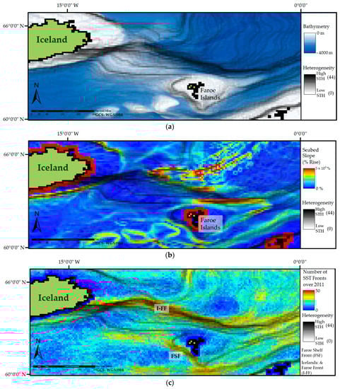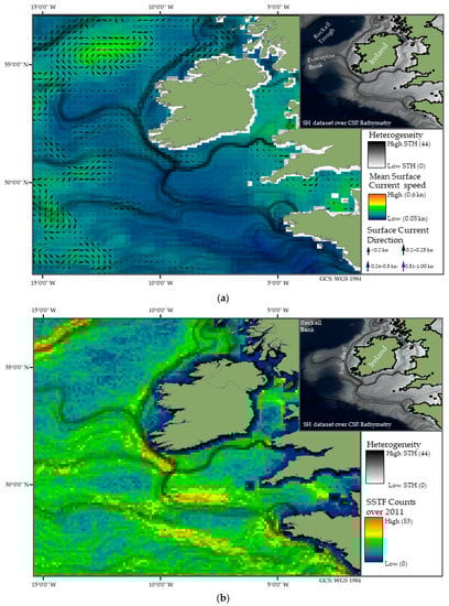 Sea surface Temperature Front (SSTF) data were generated and provided by Plymouth Marine Laboratory as outlined in [,], for the NAA area. Discrete 7-day front images were generated for 2011 (1–7 January, 8–15 January, etc.) from weekly composited microwave and infrared SST data at 9 km spatial resolution. A threshold of a minimum SST step of 0.6 °C across a pixel, was used to flag and identify the presence of a thermal front in the SST imagery []. Note that a single-day front image for 31 December was incorporated into the dataset to match the OHMA data inputs (1 January–31 December 2011). Table 1 shows the range of statistical summaries that were derived from these SSTF images.