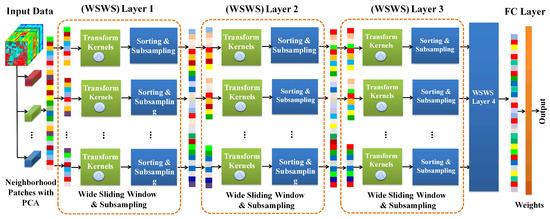In the proposed WSWS Net, the weights of the fully connected layers are learned using the least squares method, which is very convenient and easy. The validation set is used to evaluate the performance with given hyperparameters for the WSWS Net. In order to extract the features of different levels stably and effectively without overfitting, these hyperparameters are searched initially from a set of small numbers, and then increased step by step and layer by layer. The main hyperparameters for the WSWS Net are the sliding window size, numbers of transform kernels, and subsampling in each WSWS layer. The learning of spatial and spectral features using multiple WSWS layers is shown in Figure 3.