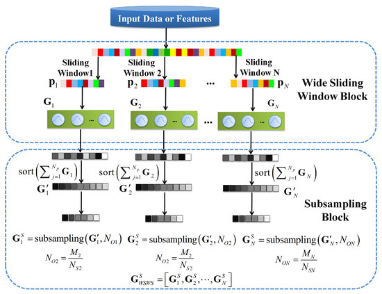 The CNN uses convolutional kernels to extract spatial features with multiple channels. The local receptive field and the weight sharing are used to reduce the number of weights of convolutional kernels. Although it is reduced a lot, the weights are learned with back propagation (BP)-based training methods for a number of epochs, which is time-consuming. Another problem is that for HSI classification, small patches are usually fed as input to convolutional layers, making it difficult to use CNN with very deep architecture. Therefore, researchers started to use different kernels to improve the performance of learning models, such as circular harmonics [37] and Naive Gabor filters [38]. In the proposed WSWS Net, the transform kernels are used as extractors, and the sliding window is used to make it much wider to represent learning features. Then, the more important extracted features are obtained with sorting and subsampling processes as the important property of WSWS layers is that the parameters of these kernels can be learned by unsupervised such as k-means or EM algorithm, or they can be obtained by randomly choosing them from training instances. The constructing process of the wide sliding window and subsampling (WSWS) layers is shown in Figure 2.