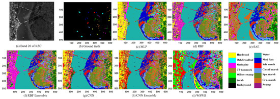 Classification results of KSC data. (a) Original image, (b) ground truth (there are no class labels for the black background), (c) MLP, (d) RBF, (e) SAE, (f) CNN, (g) RBE ensemble, (h) CNN ensemble, and (i) WSWS.