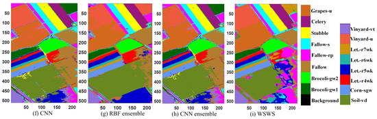 Classification results of Salinas data. (a) Original image, (b) ground truth (there are no class labels for the black background), (c) MLP, (d) RBF, (e) SAE, (f) CNN, (g) RBE ensemble, (h) CNN ensemble, and (i) WSWS.