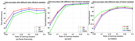 Test performance with different ratio of training samples on different hyperspectral datasets. (a) Pavia University. (b) KSC. (c) Salinas.