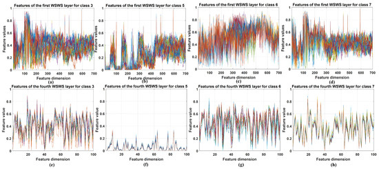 Visualization of the selected extracted features from the first and fourth WSWS layers of the Pavia University dataset. (a–d) The stacked results of extracted features of class 3, 5, 6, and 7 in the first WSWS layers from 30 training samples. (e–h) The stacked results of extracted features of class 3, 5, 6, and 7 in the fourth WSWS layers from 30 training samples.
