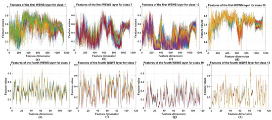 Visualization of the selected extracted features from the first and fourth WSWS layers of the KSC dataset. (a–d) The stacked results of extracted features of class 1, 7, 10, and 13 in the first WSWS layers from all the training samples. (e–h) The stacked results of extracted features of class 1, 7, 10, and 13 in the fourth WSWS layers from all the training samples.