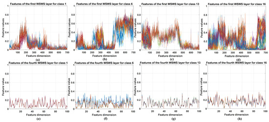Visualization of the selected extracted features from the first and fourth WSWS layers of the Salinas dataset. (a–d) The stacked results of extracted features of class 1, 6, 13, and 16 in the first WSWS layers from 30 training samples. (e–h) The stacked results of extracted features of class 1, 6, 13, and 16 in the fourth WSWS layers from 30 training samples.