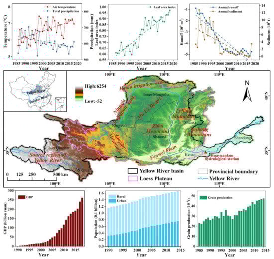 The study area combines the boundaries of the YR basin and the entire Loess Plateau with a buffer zone of 10 km, and the total area of the whole region is 967,000 km2 or roughly one-tenth of the territory of China (Figure 1). The YR basin is critical for China’s socio-economic development as well as ecosystem conservation. Over the past few decades, the economy, population, and grain production of the YR basin have all increased rapidly. In the context of drastic human activities and climate change, the YR basin has also witnessed regional greening and reduction of runoff and sediment (Figure 1). These changes not only put great pressure on the land system of the YR basin, but also brought huge challenges to the managers of the area in guaranteeing the security of food, energy, and water. Therefore, the study area needs detailed information about the land use/cover dynamic to promote conservation of the ecosystem and improve people’s lives in this water-limited region.