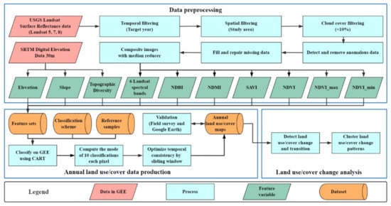 Workflow for the long-term annual land use/cover production and land use/cover change analysis in this study. Major modules include data preprocessing, annual land use/cover data production, and land use/cover change analysis.