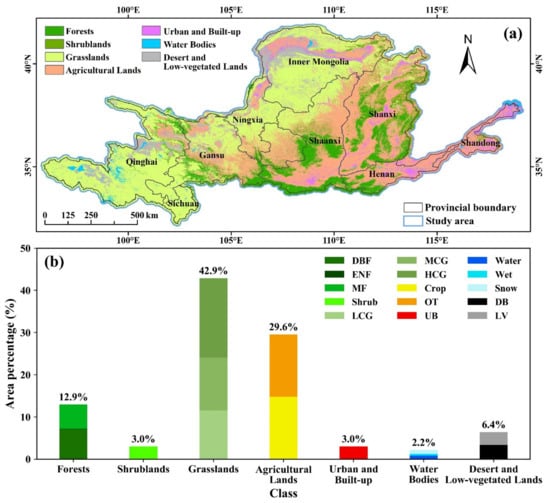 Meanwhile, our land use/cover map was compared with the seven existing land use/cover products in the first-degree classes (Table S5), including forests, shrublands, grasslands, agricultural lands, urban and built-up, water bodies, and desert and low-vegetated lands. We statistically compared the total area of each land use/cover class in the study area and selected a region covered by multiple classes of land use/cover in the middle reaches of the YR basin to compare the spatial differences in detail.