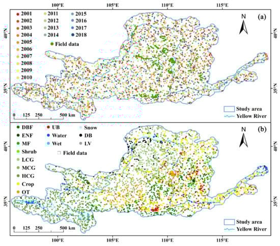 The annual land use/cover maps of the YR basin were assessed using two independent validation points sets (“Validation” in Figure 2). First, we collected field survey data during 2015, 2017, 2018, and 2019 with 640 ground samples totally which were mainly from Shaanxi, Shanxi, Inner Mongolia, and Ningxia province (Figure S6). Second, given that the long-term field data for validating historical LUCC are hard to obtain, we used the stratified random sampling approach to collect 3456 validation samples from high-resolution historical images in Google Earth, which is a practical sampling method that can satisfy most of the accuracy assessment objectives and the desirable design criteria [58,59]. Limited by the initiation of the commercial era of high spatial resolution satellites (approximately 2000), high-resolution remote sensing images before 2001 are difficult to obtain. Therefore, we performed a stratified random sampling validation on the last 18 LUCC maps which will have small standard errors in the accuracy and area estimates and benefit a full-scale accuracy assessment of the maps [58,59]. 600 validation points were selected in 2018 due to the ease of obtaining high-resolution images in this year. In 2001–2017, a stratified random sampling with the following criteria was designed: