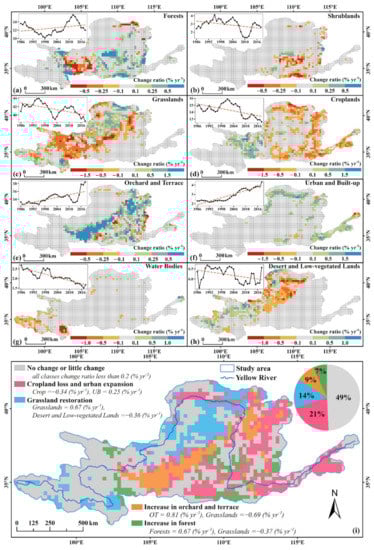During the study period, the land use/cover of the YR basin changed substantially in terms of both spatial patterns and area. The geographical distribution of change in area ratio and the land use/cover transition matrix were computed to detect the transition of different land use/cover classes (Figure 5 and Table 4). The land use/cover transition matrix showed that land use/cover changes mainly occurred in the transition from forests, grasslands, and croplands to the class of OT, accounting for 19.77% of the total change area (69,586 km2). Another obvious case was the transition of croplands to UB, accounting for 5.74% of the total change (20,200 km2). The areas where UB increased and croplands decreased were mainly distributed along the middle and lower reaches of the YR. Obvious decreases in water bodies were found in the YR source region. Area of the desert and low-vegetated lands have also decreased in the northwestern YR basin. More obviously, the area of OT increased significantly in the hilly areas on the Loess Plateau. Five LUCC patterns were clustered, manifesting different characteristics of change (Figure 5i), which are as follows: (1) no change or little change, (2) cropland loss and urban expansion, (3) grassland restoration, (4) increase in orchard and terrace, and (5) increase in forest.