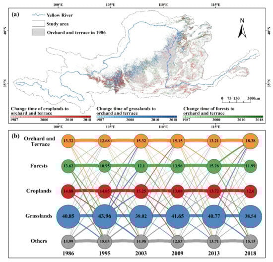 Besides the transition from forests, grassland and cropland also contributed to the increase in OT (Figure 6). Previous studies have shown that a large number of fruits have been planted in the Loess Plateau during recent years, such as apple, jujube, and peach. Statistics also showed that the fruit area and fruit production in the plateau increased by 1-fold and 3-fold, respectively, from 1998 to 2016. This land use/cover transition indicated the agricultural economic structure of YR had changed. It was confirmed by a recent study which has stated that the ratio of fruit production to the total crops on the Loess Plateau increased from 14% to 23%, while grain crops decreased from 44% to 37% over the period 2000–2015 [75]. These economic trees not only increased the greenness but also raised the income [69,76]. YR will achieve a win-win scenario balancing the smooth implementation of the government’s environmental protection policy and increase in farmers’ income. For example, a study in a small watershed on the Loess Plateau has shown that fruit sales as a percentage of total income increased dramatically by 59%, which may be existed in similar rural areas [77]. The massive increase in OT suggested that YR progress towards sustainable development goals for livelihood security, economic growth, and ecosystem conservation. In fact, China has made great efforts for achieving global Sustainable Development Goals (SDGs) via a diverse range of policy instruments [22,78]. A recent study has shown that investment in the 16 major sustainability programs for the land-system in China was far exceeded other globally important national sustainability programs [22,79]. These programs have substantially improved agricultural production efficiency, natural environment, and the quality of life in rural areas through agricultural production and cultivated land protection, forest ecosystem protection, and grassland restoration, which promotes the sustainable development of human and natural systems and reflects a great achievement of policy and governance of China. The land use/cover transition of our findings was just a specific embodiment of one aspect. All of which reflected the rapid land use/cover dynamics with intense human activities in a short time on the YR basin, highlighting the importance of annual maps of land use/cover for understanding the interaction between human and natural systems.