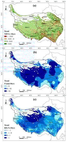 The variability of each climatic factor and NDVI variability were found to display the same spatial relationship in the southern regions (ER2AB1 and ER2C2) of the Tibetan Plateau. In addition, the variability of each climatic factor tested except RH was positively correlated with NDVI variability in these regions (Figure 6 and Figure 7). This suggested similarities in the mechanisms by which climate change impacts vegetation growth and cover in these regions. In these two regions, the NDVI was predominantly affected by precipitation (Figure 5). In region ER2AB1, there was a decrease in precipitation (Figure 2b) but a relatively marked decrease in its NDVI (Figure 2a). In other words, a high rate of decrease in precipitation led to a high rate of decrease in the NDVI. An opposite pattern characterized region ER2C2: there, both its precipitation and NDVI have increased (Figure 2a and b). Put differently, a faster rise in precipitation levels fostered a high rate of increase in the NDVI. Arguably, changes in precipitation were the principal driving factor for differential vegetation growth and cover between these regions.