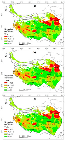 The spatial pattern regression coefficients for temperature (a): Tave; (b): Tmax; (c): Tmin, in the geographically weighted regression model.