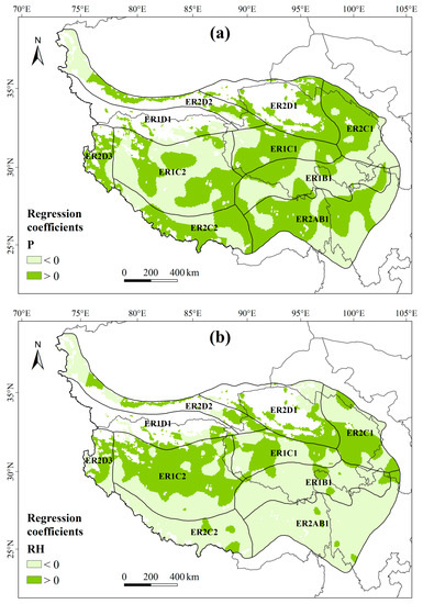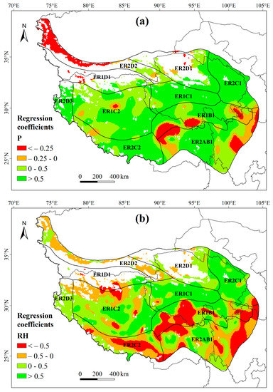 The GWR results for the NDVI and moisture indices showed a positive spatial correlation between the NDVI and precipitation in most regions of the Tibetan Plateau (Figure 4a), so an increase in precipitation could increase the NDVI in these regions. A negative spatial correlation between the NDVI and RH was found in some southern and northwestern regions of the Tibetan Plateau (Figure 4b). An increase in RH might result in stomatal closure in vegetation and weaken its transpiration [32] and, as a result, inhibit its growth and development. This phenomenon was the most prominent in some parts of southern regions, namely, ER1B1, ER2AB1, and ER2C2.