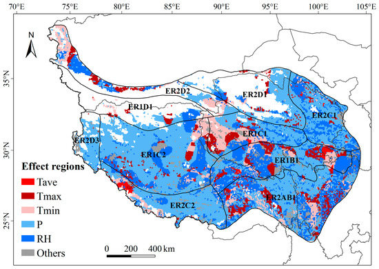 Overall, the climate on the Tibetan Plateau is characterized by low temperatures, large temperature differences, intense radiation, and high precipitation in summer [33]. In addition, those effect regions of climatic determinants on NDVI on the Tibetan Plateau in this study are consistent with those found across China (at a higher scale and lower resolution) [34]. As temperature rises, the response of vegetation growth to temperature becomes increasingly prominent [35,36]. Before reaching the optimum temperature for photosynthesis, temperature rises will facilitate photosynthesis [37], which we found in some parts of the plateau sub-cold zone (ER1). Beyond this optimum temperature, warming will, on the one hand, improve vegetation respiration and accelerate nutrient consumption (e.g., the northeast Tibetan Plateau) and, on the other hand, accelerate moisture evapotranspiration and reduce the accumulation of organic matter content [38], as it did in the southeast Tibetan Plateau. Changes in moisture can, to a certain extent, modify vegetation growth and cover in the largest areas of the Tibetan Plateau during the study period. However, more moisture can also hinder vegetation growth and reduce vegetation cover by increasing cloud cover and RH [32], which could be found in some sub-humid regions (e.g., ER1B1). As many studies have shown, the response of NDVI on the Tibetan Plateau to climate change follows a nonlinear process and generates a composite effect [39,40,41]. Consequently, this necessitates an examination of the spatial distribution and temporal dynamic patterns of vegetation growth and cover through multifactor comprehensive analysis, and provides the theoretical reference for natural restoration of alpine ecosystem.