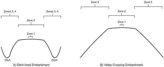 (A) Cross-sections of a ditch-lined embankment and corresponding embankment zones; (B) An embankment at a valley crossing and the corresponding embankment zones. These cross-sections are idealized conceptual profiles and not derived from real embankments.