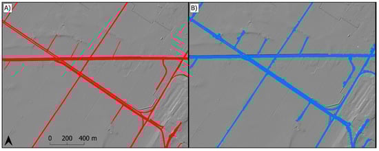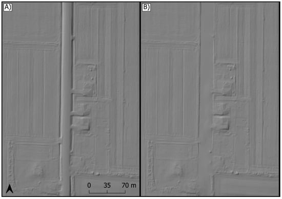 Although the embankment surface and associated ditches are faithfully captured in fine-resolution DEMs, the culverts that pass beneath embankments are not [1,4,5]. Without culverts, digital embankments become artefact dams that exhibit different hydrological behaviour than real embankments. Digital embankments can create extensive upslope areas of artefact depressions, which impede the modelling of hydrological flow and connectivity, and influence modelled flood potential and contaminant delivery [1,4,6,7,8,9,10]. Typically, it is best to employ hydrological conditioning techniques such as filling and breaching to remove artefact depressions created by embankments [1,4,11,12]. However, these conditioning techniques cannot recreate a pre-embankment surface necessary for applications such as historical flow modelling.